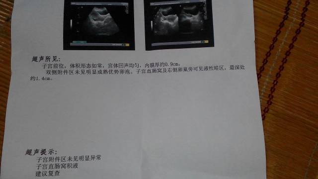 子宫前卫,体积形态如常,宫体回声均匀,内膜厚约0.9 Cm.双侧附件未见明显成熟优势卵泡,子宫直