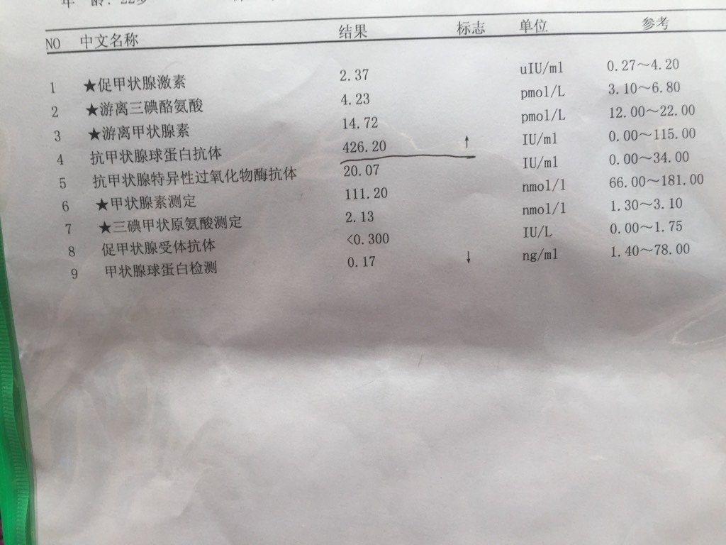 怀孕七周,第一次检查,抗甲状腺球蛋白抗体425,正常范围1到115 其他值都正常 对胎儿有没 怀孕七周,第一次检查 ,抗甲状腺球蛋白抗体425,正常范围1到115。 其他值都正常。对胎儿有没有影响。 点击展开 随梦啊 2016-08-15 11:03 为您推荐: 其他回答 找专业医生看看,是不是甲状泉不正常 睿萱妈咪 2016-08-15 13:58 这个医生会给你讲解的 吴甜 2016-08-15 13:42 不会啊。。。。。 谢春芳 2016-08-15 13:18 没有。。。 以艻 2016-08-15 12:52 ,,,,, 跟着感觉走→ 2016-08-15 12:44 加载更多 相关问题 今儿孕前检查,查出甲状腺过氧化物酶抗体>1300(参考范围0-60),甲状腺球蛋白抗体379 30(参考范围0-60),请问影响怀孕吗? 抗甲状腺球蛋白抗体高影响怀孕吗?别的都在范围内 抗甲状腺球蛋白抗体高影响怀孕吗?别的抗体都在范围内