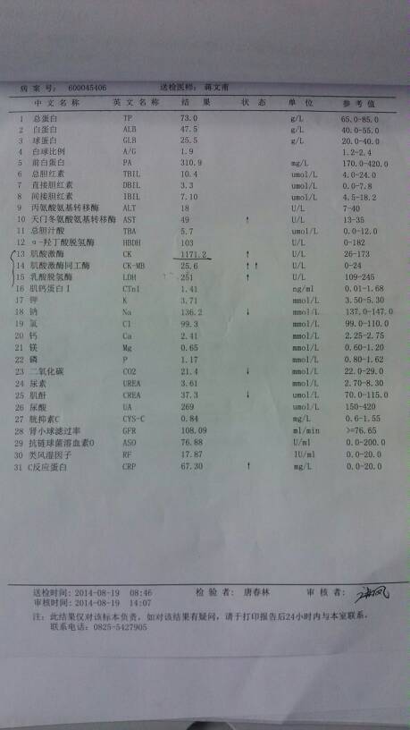 宝宝8岁,发烧住院了,有医生看的懂这个验血报告吗?谢谢! 宝宝8岁,发烧住院了,有医生看的懂这个验血报告吗?谢谢! 点击展开 Cute.沐 2014-08-21 12:11 为您推荐: 其他回答 您好,首先C反应蛋白升高一般提示有细菌感染,心肌酶谱升高提示心肌受到感染或者毒素损伤,其他的都在正常范围,肌酐尿素氮减少可能跟尿量较多有关系。 衷喜明2 2014-08-21 12:15 相关问题 孕酮低很严重吗 我的孕酮只有15医生开了药 过几天去验血要是没提上去怎么办么 宝宝会不会有影响 医生,宝宝发烧反反复复的怎么办啊,今天第二天了,38 下老睡觉,要去验血吗