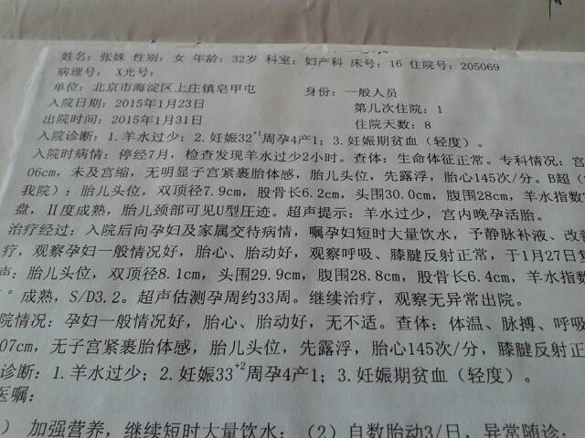 宝妈,医生们帮我看看这个检查病例,怎么样? 宝妈,医生们帮我看看这个检查病例,怎么样? 点击展开 137*****063_6nh5 2015-01-31 11:04 为您推荐: 其他回答 从你的检查上面看,提到目前你的羊水减少,有脐绕颈,孕晚期,胎心好。这个情况如上医生提到的就可以了,动态监测羊水就可以了。 cn#BLVLfkBVfL 2015-02-04 12:24 医生没有说呢… 从此以后。 2015-01-31 11:34 我是羊水多? 137*****660_cWPo 2015-01-31 11:21 这写得很清楚呀,就是羊水少 5201314张宝宝 2015-01-31 11:18 相关问题 宝妈,医生们,帮我看看我做的检查正常嘛? 请医生或有经验的宝妈帮我看看,然后给意见谢谢各位 有医生吗帮我查下宝宝现在有多重?谢谢 各位宝妈也帮我看看宝宝有多重 谢谢