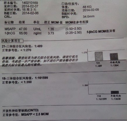唐筛结果显示为高风险,HCG值3.73异常 详见图片 咨询下有多严重,可以不做羊穿或者无创D NA检查。 点击展开 匿名用户 2014-02-19 18:01 为您推荐: 其他回答 病情分析: 你好,你的情况检测的指标提示有异常。 指导意见: 建议你还是应该考虑做一下无创DNA检查排除一下染色体畸形的肯恩。 匿名用户 2014-02-19 20:00 相关问题 我今年34岁了,但在19周4天时做唐筛,21三体显示值是1:300,医生说是高风险,叫我做无创或羊 唐筛结果显示为高风险,HCG值3 73异常 详见图片 咨询下有多严重,可以不做羊穿或者无创DN