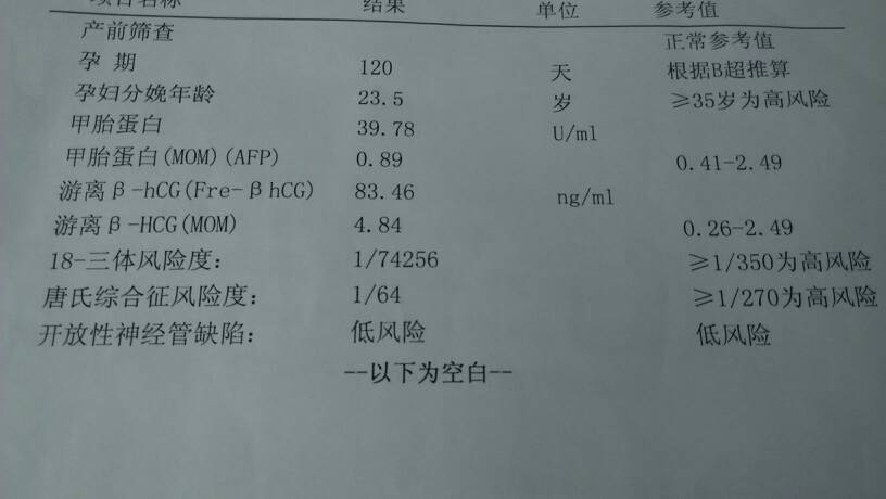 帮我看看唐筛报告,哪一项有问题? 帮我看看唐筛报告,哪一项有问题? 点击展开 ╰つ小米飯×丶 2015-05-18 15:17 为您推荐: 其他回答 不会看!!! 萱萱我爱你 2015-05-18 17:37 祝宝妈好孕 小女人_usUE 2015-05-18 16:19 综合症那个不行 胖花花猫 2015-05-18 15:43 21三体唐氏综合症高风险,要进一步检查 520……悦熙 2015-05-18 15:35 唐氏综合症是高风险,医生可能会建议你做羊穿,我之前是中风险,我做了无创DNA,对孩子影响小一点 SpongeZhen 2015-05-18 15:29 加载更多 相关问题 唐筛报告大伙能帮我看看吗 妹妹比我先怀孕一个月,唐筛报告说她的是男孩,说我这个是肯定是女儿,我想知道准不准,有没有宝妈能帮我看看准不准啊 宝妈们帮我看看唐筛报告是男宝还是女宝,没有性别的歧视只是特别的好奇,呵呵,想给宝宝买衣服不知道买男宝还是女宝的,谢谢大家啦!谢谢