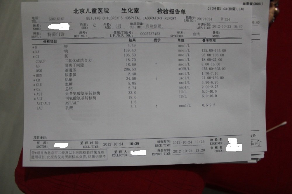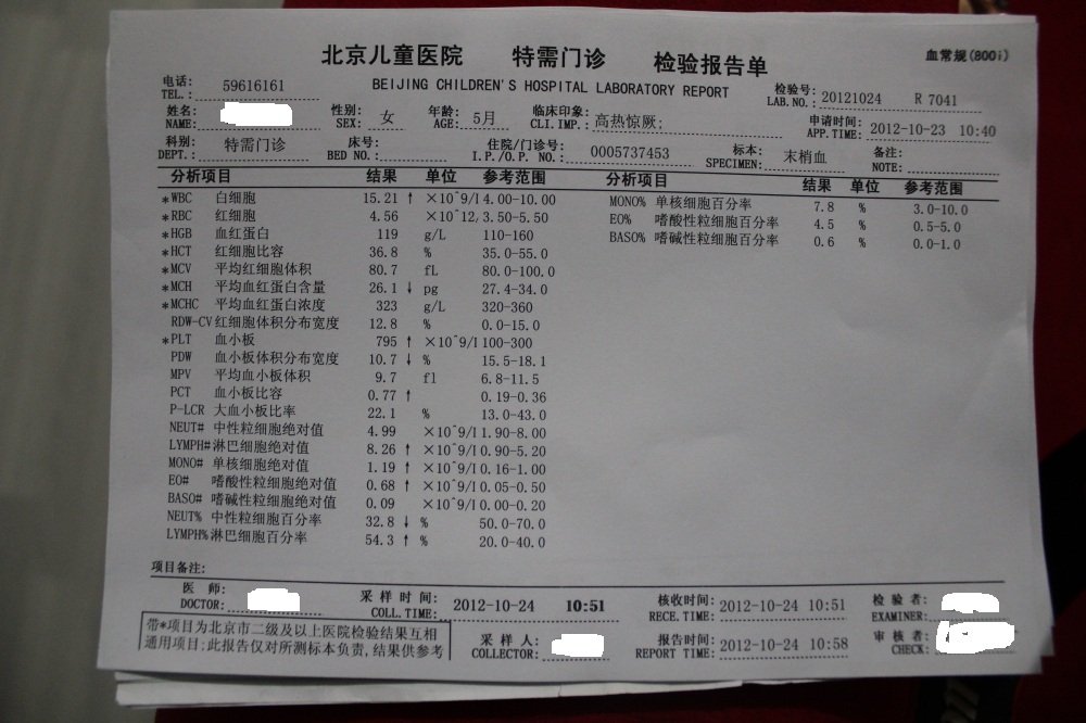 懂医的朋友帮忙看看6个月宝宝的血液化验单,能不能看出什么问题,貌似是有炎症,但是孩子吃消炎药就拉肚子 患者信息:女 1岁 北京 西城区 点击展开 匿名用户 2012-10-25 21:23 为您推荐: 其他回答 是有些感染 ,不过你小孩的血小板太高,保险起见还是去血液科看看吧 匿名用户 2012-10-26 19:55 高热惊厥。。是发烧又给捂得太多了? 我不学医,只懂得白细胞高应该是有感染。还是请教医生吧。 祝宝宝早日康复。 斋清嘉_ggo8 2012-10-25 21:26 相关问题 貌似是怀孕了,可前期因为牙疼吃了点消炎药 貌似是怀孕了,可前期因为牙疼吃了点消炎药 消炎药 对hiv血液检测试纸有冲突吗