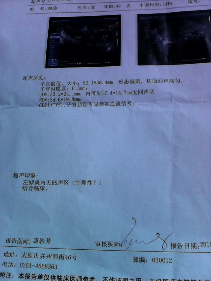 子宫前位,大小52.1*38.4mm,形态规则切面回声均匀,子宫内膜厚6.3mm,LOV33.2* 子宫前位,大小52.1*38.4mm,形态规则切面回声均匀,子宫内膜厚6.3mm,LOV33.2*21.4mm,内可见17.4*14.7mm无回声区,ROV34.6*19.8mm,CDFI子宫肌层可见散在血流信号,超声印象:左卵巢内无回声区,看不大懂请赐教,谢谢! 点击展开 🐵baby🐵 2015-10-14 17:12 为您推荐: 其他回答 不清楚。。 卢彬 2015-10-14 19:19 没事的,。。 身高像爸爸 2015-10-14 18:43 你是检测卵泡还是什么 期待宝贝降临 2015-10-14 17:51 相关问题 这是 结果:子宫前位,大小约44×3 2×47mm,形态欠规则,横切面增宽,实质回声均匀,宫腔内 做的彩超,子宫前位大小38*27 5mm,形态规则,切面回声均匀子宫内膜厚:5 1mm,LOV 彩超子宫前位大小38 0*27 5mm,形态规则,切面回声均匀,子宫内膜厚,5 1mm,LOV: