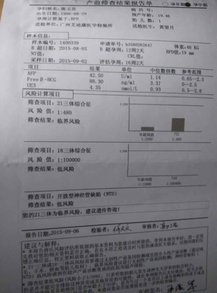 唐氏筛查临界风险是什么?神经管缺陷是怎么回事??要不要复查??担心… 唐氏筛查临界风险是什么?神经管缺陷是怎么回事??要不要复查??担心…… 点击展开 小5妈妈 2015-10-21 11:41 为您推荐: 其他回答 听医生的,,, 锁心_ryds 2015-10-21 12:29 需要复查啊 麒轩妈妈 2015-10-21 12:11 听医生的吧 芳圈圈 2015-10-21 12:00 需要咨询下医生 男人玩闹《拿钱开道 2015-10-21 11:59 问问医生吧, 痴心不改624 2015-10-21 11:58 加载更多 相关问题 唐氏筛查显示神经管缺陷的结果是临界风险,严重吗 求助:唐氏筛查结果就开放性神经管缺陷 临界风险!有没有懂得,这种情况咋办呀??? 有没有唐氏筛查神经管缺陷高风险的宝妈?怎么排除的?