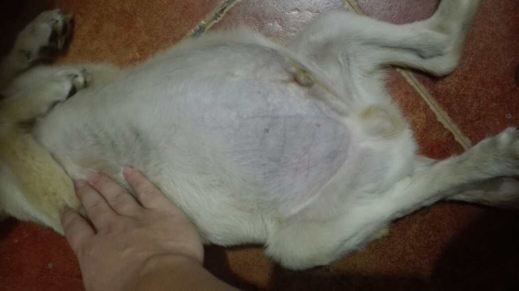 它这是胀气了,吃今筛贸多了也会引起,还有你的安殖狗简直是营养不良,可能体内有虫,你买点打虫药给它吃乡葛,打过疫苗没?