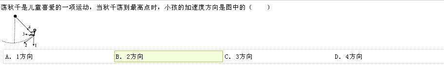 荡秋千是儿童喜爱的一项运动,当秋千荡到最高点时,小孩的加速度方向是图中的 为什么这道题中的合力是沿着切线方向的? 点击展开 匿名用户 2014-05-05 18:25 满意回答 因为在那一瞬间他将由静止向切线方向运动 匿名用户 2014-05-05 20:40 宝宝知道提示您:回答为网友贡献,仅供参考。 相关问题 荡秋千是儿童喜爱的一项体育运动,当秋千荡到最高点时,小孩的加速度方向是图中的( ) A.a方向 3岁9个月小孩荡秋千十几分钟后晕倒恶心呕吐全身无力,去医院抽血化验,做CT,心电图后均无大碍,差不 在如图中两个体重相同的小孩静止坐在秋千上,两秋千的绳子是一样的.下面的叙述正确的是( )A.甲中
