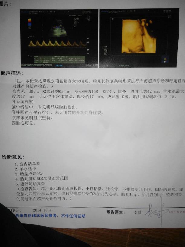 刚做的三维彩还没得给医生看结果,宝妈们帮忙看一下正常不? 刚做的三维彩还没得给医生看结果,宝妈们帮忙看一下正常不? 点击展开 136*****596_ohR7 2014-10-04 11:40 为您推荐: 其他回答 你好,看报告宝宝在这个阶段是没有问题的。记得按时产检啊,了解宝宝的的生长情况。 文斯6 2014-10-05 11:04 正常的宝妈放心 勿忘我_3W08 2014-10-04 15:39 很正常的啊 妈咪最爱👄 2014-10-04 13:40 这次检查的结果是正常的 酢浆草 2014-10-04 11:59 应该是正常的 最爱woshiranyi 2014-10-04 11:45 相关问题 为什么其他宝妈们照四维或三维彩超都可以看到宝宝的样子?我之前照的时候就在电脑上看到宝宝,可是医生给 我五个半月了,刚做了三维彩超,股骨长径41mm,腹围193mm,医生说偏小,别的发育一切正常,有宝 现在是25+6 三维显示25+3 请在线的医生帮我解答也请会看的宝妈们帮我解答 十分十分感谢
