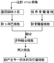 (1)此处基因敲除技术的受体细胞不是小鼠的受精卵,而是小鼠的B淋巴细胞细胞,因为B淋巴细胞可以产生抗体. (2)在诱导细胞融合时,若考虑两两融合,则有AA、BB和AB三类细胞,而在制备单克隆抗体的制备过程中需要异种细胞核融合的细胞,所以需要选择培养基的筛选才能获得所需要的杂交瘤细胞,该细胞既能无限增殖又能产生专一抗体. (3)第一次筛选是选出AB;型的细胞(用字母组合表示),筛选具体方法是在培养基中加入某种物质,抑制骨髓瘤细胞DNA的复制,而B细胞DNA复制虽不受影响,但增殖能力很有限,只有杂交瘤细胞可以借助B细胞DNA复制的途径,继续增殖.此种培养基称为选择培养基. (4)将能产生抗H7N9病毒的杂交瘤细胞在动物培养液中进行培养,其培养液与植物组织培养的MS培养基相比,特有成分是动物血清或血浆. (5)利用上述技术生产的单克隆抗体可制作成诊断盒,用于准确、快速诊断H7N9禽流感病毒的感染者,这种诊断运用了抗体--抗原杂交技术. (6)由于骨髓瘤细胞是效应T细胞要攻击杀死的靶行絮细胞,两者不可能融合成杂交瘤细胞,所以不能岩斯利用经H7N9病毒免疫后小凡侨匪鼠效应T细胞与小鼠骨髓瘤细胞融合,形成杂交瘤细胞.故答案为:(1)B淋巴细胞;;;;(2)3;;;;(3)AB;;;;选择;;;;(4)动物血清或血浆(5)抗原-抗体;;;;(6)不可行;;;骨髓瘤细胞是效应T细胞要攻击杀死的靶细胞,两者不可能融合成杂交瘤细胞