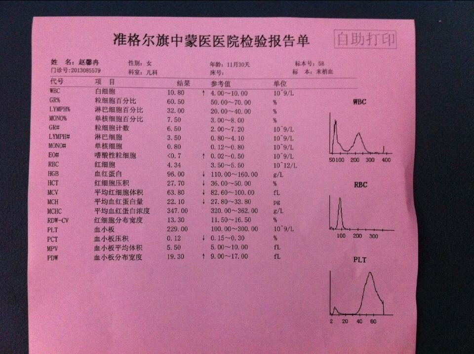 宝宝10个月零2个星期,流清鼻涕流了快14天,不见好,今天突然发烧 ,体温一会正常,一会温度高了,高的时候上到39.1华氏度。去医院做了血常规,医生看了说可能是急诊,给配了些感冒药、退烧药,就让我们回来了,以下就是血常规检验报告,请高手,给看看这能看出什么不?