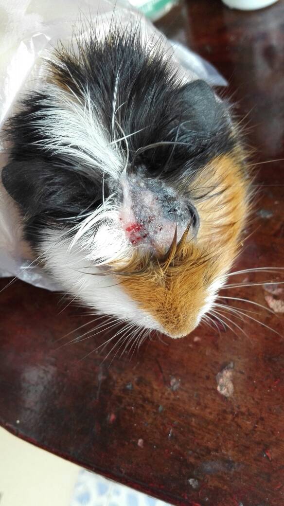 荷兰猪脑袋上皮肤病越来越严重,之前用碘伏和小孩用的真菌药膏擦过,今天刚用兔博士真菌消擦过,也不知有
