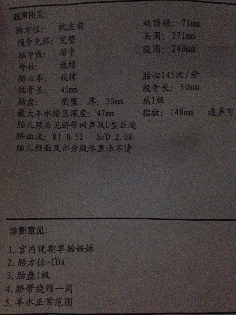 从此次b超检查结果看,胎儿的发育符合孕周的表现,胎位正常,胎心率和羊水量在正常范围内,胎盘附着位置正常;但存在脐带绕颈的现象。建议每日坚持数胎动,定期检查。