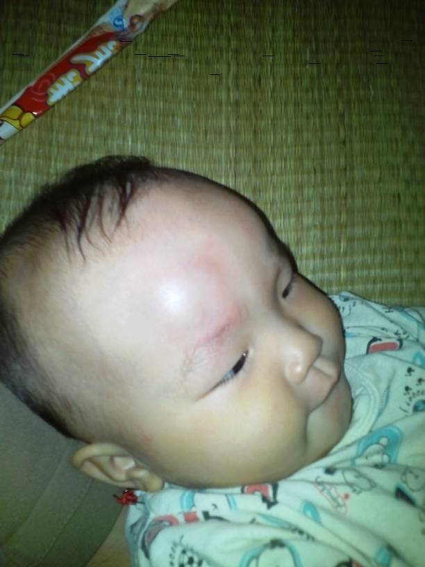 你孩子的表现看是需要考虑和外伤后局部的软组织的损伤有关系的,你可以先观察看看的,适当的吃阿莫西林的,不增大问题不大的,同时观察看看孩子是否有呕吐的,要是有是需要检查头部的CT看看的。