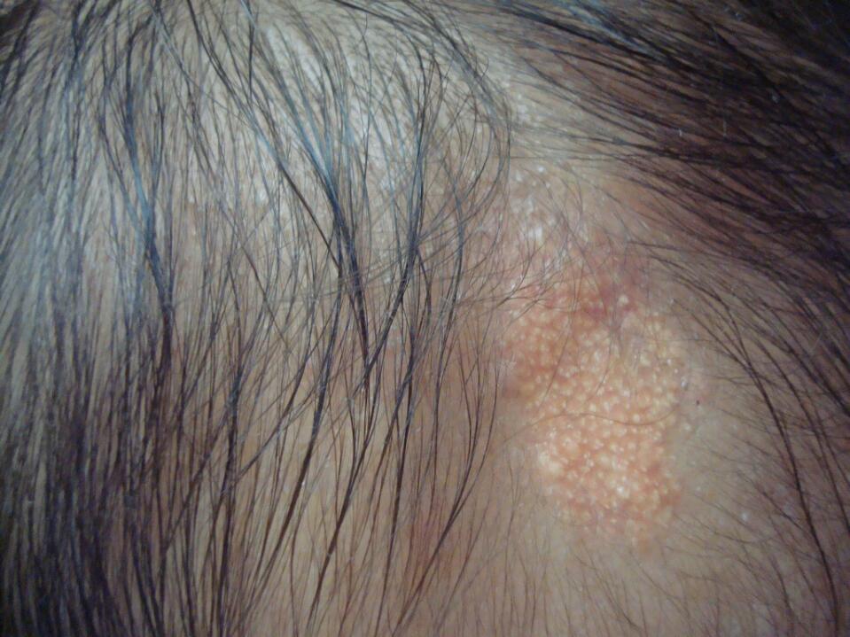 新出生的婴儿前额头顶右侧的头皮有一块地方,硬币大小,没长头发,而且长些密密麻麻黄白颗粒物质