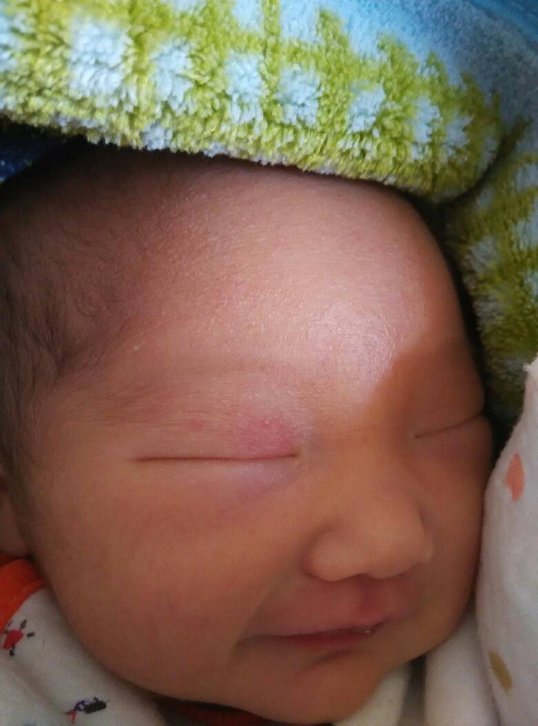 宝宝刨妇产第四天 医生刚给我们的时候左眼上有明显抓痕,以为是她自己抓的,因为看见过她自己在脸上抓的