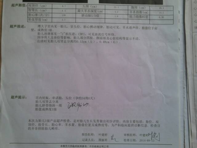 这是本人31周的彩超,麻烦各位医生帮忙看看 这是本人31周的彩超,麻烦各位医生帮忙看看 点击展开 给你一点鲜花 2014-09-16 14:15 为您推荐: 其他回答 你好,你家的数据单还是比较模糊的,看的不是很清楚的,还是建议你多听从医生的 非一般170 2014-09-16 19:08 相关问题 医生帮忙看看,这是16周+3的彩超 宝宝发育得好不好啊?? 我2014年7月20号检查医生说我怀孕31周,请问我的末次月经是什么时候,大概的受孕时间是?麻烦了 今天做的四维彩超,双肾肾虚分离,左肾6 9mm,右肾4 7mm,医生让我两周后再去做个彩超 让我很