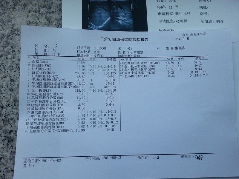 帮我看看这个新生儿的血常规化验单有什么问题 点击展开 匿名用户 2014-06-04 15:12 满意回答 画着向上箭眨称昌头的就是血液内含量偏高,最后一列参考值是正常的涌索范训间围 同家馨_5oXy 2014-06-04 16:52 宝宝知道提示您:回答为网友贡献,仅供参考。 相关问题 新生儿 血常规化验单 看看是否有问题 我怀孕36周了,昨天开始嗓子疼这是今天的血常规化验单,想请专业的大夫帮我看看都什么情况?我从小就 请医生帮我看看血常规化验单,我没有任何感冒症状,不发烧,没有痰,不咳嗽