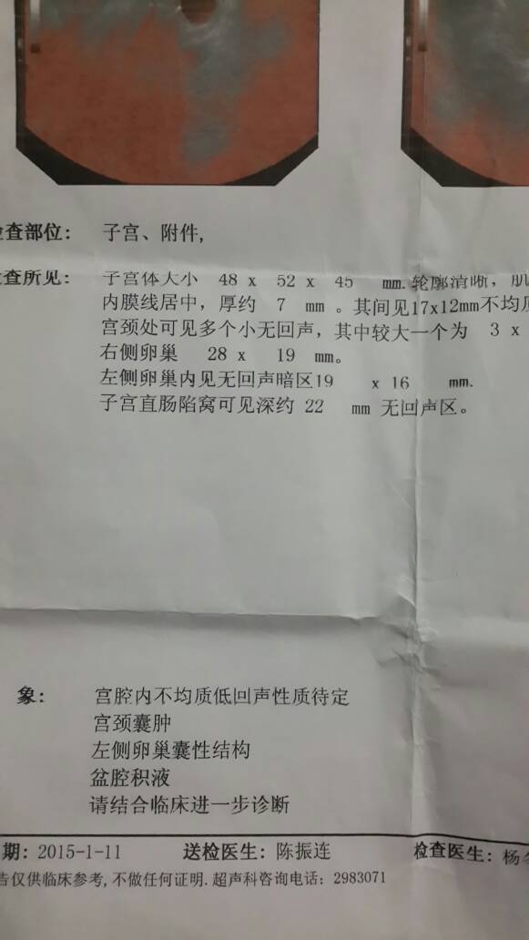 月经干净5天后,同房出了好多血,鲜红的,第二天去医院检查,有宫颈囊肿,7.8个有米粒大小,医生说看血是从宫颈里流出的,看病时候医生说不出血了,又做了个病理诊断,做了个B超是阴超,也吃了药,现在有一个星期了,可是还流咖啡色的分泌物。这是B超单,病理诊断,说是轻度炎症,没有病变和癌细胞,现在我很着急!!!