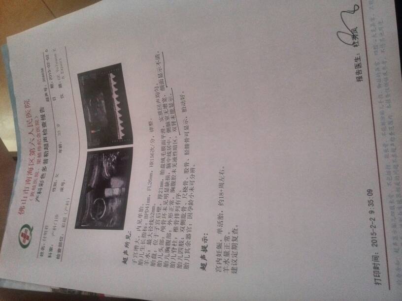 有医生吗?我这张彩超报告正常吗?约18+周左右,颜面显示不清,双肾未能显示、胎儿发育好不好? 有医生吗?我这张彩超报告正常吗?约18+周左右,颜面显示不清,双肾未能显示、胎儿发育好不好? 点击展开 152*****830 2015-02-06 11:06 为您推荐: 其他回答 从你的B超检查结果来看,你的数据双顶径和股骨长还有其他的情况基本上都是符合你的孕周,正常的。 panshanneng 2015-02-07 19:57 我不是医生,,, 六月雪纷飞 2015-02-06 11:34 相关问题 不想做彩超,想知道胎儿发育的好不好是不是验血,验孕酮就可以 不想做彩超,想知道胎儿发育的好不好是不是验血,验孕酮就可以