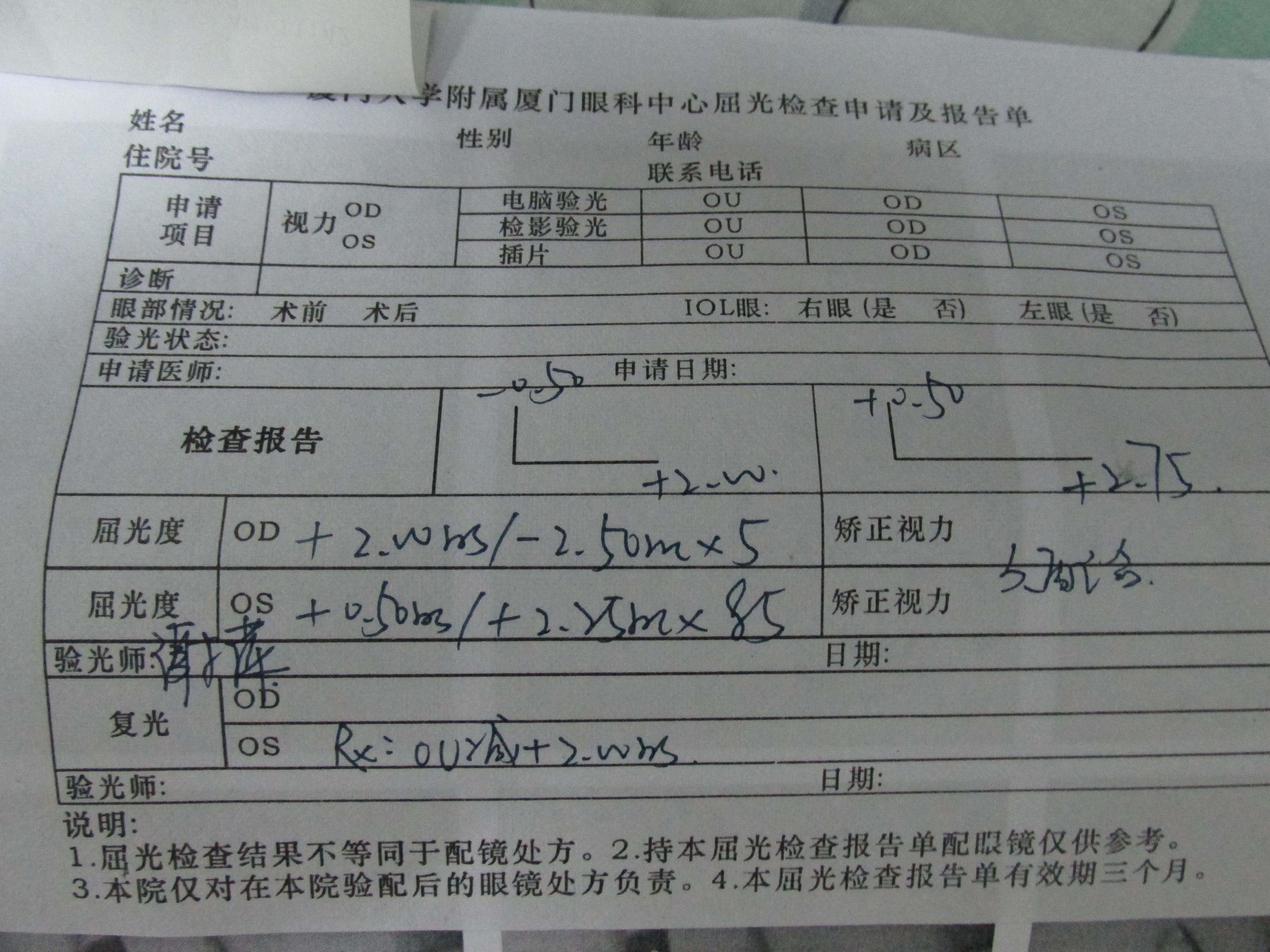 第一张和第二张都是电脑验光单,但是两个单上面的结果都有区别,特别是左眼L。 中间那张是检查记录单,包括:电脑验光,检影结果,插片结果。从这个上面看是有屈光异常的,但是没有裸视和矫正实力的记录!!!你这个应该是检查的结果,还没配眼镜吧?