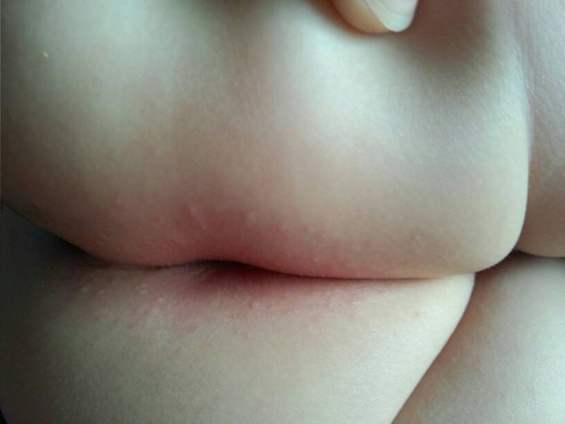 是尿布疹,擦点氧化锌软膏,一下就好了。以后孩子洗澡后擦点香油,隔下尿,就不会有尿布疹了。