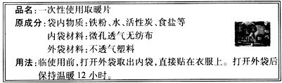 小牛寒假去东北玩,妈妈给他买了“暖宝宝”取暖贴 他阅读使川说明后,对它的成分和发热原理产生了兴趣
