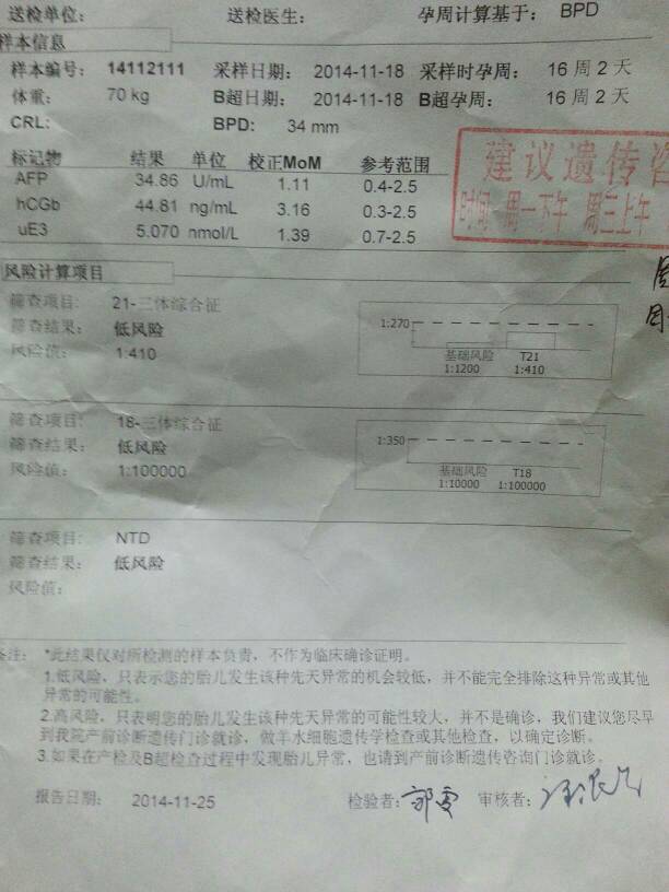 唐氏检查,21-三体综合征是1/410我需要做无创DNA 唐氏检查,21-三体综合征是1/410我需要做无创DNA 点击展开 130*****090_rRfq 2014-12-08 23:34 为您推荐: 其他回答 你好,唐氏筛查的结果值出于临界风险状态,最好进一步做一下羊水穿刺或者无创DNA的检查比较好的。 天使在人间455 2014-12-09 20:10 为什么要做DNA呢? 淡香的果儿 2014-12-09 13:34 要2500 Enna49 2014-12-09 08:27 没必要,何必花那冤枉钱 中国凤凰8 2014-12-09 07:34 低风险都是好的呀! J&M 2014-12-09 05:16 加载更多 相关问题 怀孕18周了,做唐氏查出21三体综合症1:90,刚做了无创DNA,在等结果,不知道这种概率大不大? 糖筛结果21三体综合征1:581是不是高风险 必须做无创DNA检测呢 好担心 怀孕16周唐筛的结果1:35 21三体综合征高风险,后来做了羊穿跟无创DNA,结果都是1异常,宝宝我还能要吗?