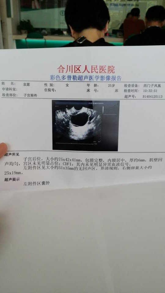 子宫后位,大小约75*42*41mm,包膜完整,内膜居中,厚约6mm,肌壁回声均匀,宫区未见明显占