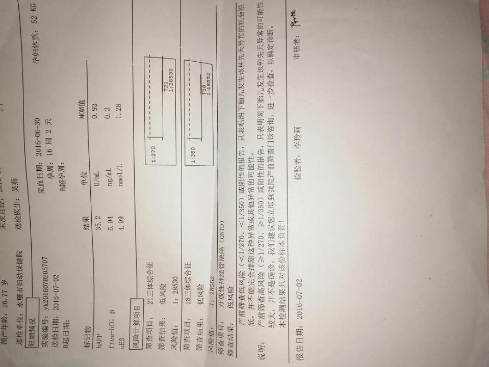 有没有说可以看的懂了B超单或者唐筛结果分男女的,帮忙看看 有没有说可以看的懂了B超单或者唐筛结果分男女的,帮忙看看 点击展开 159*****532_uOBS 2016-07-14 07:14 为您推荐: 其他回答 看不懂…… 134*****837_ir29 2016-07-14 07:49 不知道…… 晓光掠影 2016-07-14 07:41 看不懂。。 156*****428_JHeW 2016-07-14 07:40 不准。。。。。 梅花香自苦寒来_6I2t 2016-07-14 07:37 不会!!! 小宇的麻麻 2016-07-14 07:31 加载更多 相关问题 听说唐筛单能看男女? 唐筛怎么看男女呢 帮忙看看 谢拉着啦 AFP 测试结果:32 82 测试单位:ng/ml MOM值 我怀孕18周,产前筛查唐筛是低风险1:760,B超单中胎儿左心室可见强光点,医生建议我做羊水穿刺,是否有必要做