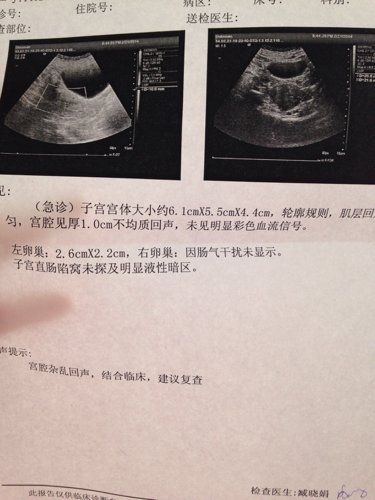 药流后做B超显示、子宫宫体大小约6.1m×5.5m×4.4cm\轮廓规则、肌层回声均匀、宫腔见厚1