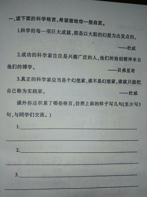 ● 科学要求每个人有极紧张的工作和伟大的热情. ——巴甫洛夫 ● 浪费时间是一桩大罪过. ——卢梭 ● 理想的书籍是智慧的钥匙. ——托尔斯泰 1.如果我们过于爽快地承认失败,就可能使自己发觉不了我们非常接近于正确.---卡尔·波普尔 2.“难”也是如此,面对悬崖峭壁,一百年也看不出一条缝来,但用斧凿,能进一寸进一寸,得进一尺进一尺,不断积累,飞跃必来,突破随之.---华罗庚(中国) 3.我真想发明一种具有那么可怕的大规模破坏力的特质或机器,以至于战争将会因此而永远变为不可能的事情.---诺贝尔(瑞典) 4.只有顺从自然,才能驾驭自然.---培根(英国) 5.真理的大海,让未发现的一切事物躺卧在我的眼前,任我去探寻.---牛顿(英国) 6.谬误的好处是一时的,真理的好处是永久的;真理有弊病时,这些弊病是很快就会消灭的,而谬误的弊病则与谬误始终相随.---狄德罗(法国) 7.凡在小事上对真理持轻率态度的人,在大事上也是不足信的.---爱因斯坦(美国) 8.人的天职在勇于探索真理.---哥白尼(波兰) 9.我不知道世上的人对我怎样评价.我却这样认为:我好像是在海上玩耍,时而发现了一个光滑的石子儿,时而发现一个美丽的贝壳而为之高兴的孩子.尽管如此,那真理的海洋还神秘地展现在我们面前.---牛顿(英国) 10.科学的灵感,决不是坐等可以等来的.如果说,科学上的发现有什么偶然的机遇的话,那么这种“偶然的机遇”只能给那些学有素养的人,给那些善于独立思考的人,给那些具有锲而不舍的精神的人,而不会给懒汉.---华罗庚(中国) 11.一个科学家应该考虑到后世的评论,不必考虑当时的辱骂或称赞.---巴斯德 (法国) 12.我们在享受着瓣否评他人的发明给我们带来的巨大益处,我们也必须乐于用自己的发明去为他人服务.---富兰克林(美国) 13.我的人生哲学是工作,我要揭示大自然的奥妙,为人类造福.---爱迪生(美国) 14.我平生从来没有做出过一次偶然的发明.我的一切发明都是经过深思熟虑和严格试验的结果.---爱迪生(美国) 15.发展独立思考和独立判断的一般能力,应当始终放在首位,而不应当把获得专业知识放在悟豆首位.如果一个人掌握了他的学科的基础理论,并且学会了独立地思考和工作,他必定会找到他自己的道路,而且比起那种主要以获得细节知识为其培训内容的人来,他一定会更好地适应进步和变化.---爱因斯坦 (美国) 16.一切推理都必须从观察与实验得来.---伽利略 (意大利) 17.要学会做科学中的粗活.要研究事实,对比事实,积聚事实.---巴甫洛夫 (俄国) 18.我的那些最重要的发现是受到失败的启示而作出的.---戴维 (英国) 19.感谢上帝没有把我造成一个灵巧的工匠.我的那些最重要的发现是受到失败的启发而获得的.---戴维 (英国) 20.我坚持奋战五十余年,致力于科学的发展.用一个词可以道出我最艰辛的工作特点,这个词就是“失败”.---汤姆逊 21.对搞科学的人来说,勤奋就是成功之母.---茅以升(中国) 22.运动是一切生命的源泉.---达·芬奇(朗掏意大利) 23.科学的基础是健康的身体.---居里夫人(法国) 24.没有侥幸这回事,最偶然的意外,似乎也都是有必然性的.---爱因斯坦(美国) 25.我要把人生变成科学的梦,然后再把梦变成现实.---居里夫人(法国) 26.科学是没有国界的,因为她是属于全人类的财富,是照亮世界的火把,但学者是属于祖国的.---巴斯德(法国) 27.我愿用我全部的生命从事科学研究,来贡献给生育我、栽培我的祖国和人民.---巴甫洛夫(前苏联) 28.历史告诫我们说,一种崭新的真理惯常的命运是:始于异端,终于迷信.---赫胥黎(英国) 29.总有一天,真理会取胜.即使真理在他一生中未能得到胜利,为了坚持真理也会使他变得更好,更加聪明.---赫胥黎(英国) 30.使人们宁愿谎言,而不愿追随真理的原因,不仅由于探索真理是艰苦的,也不仅由于真理会约束人的想像,而且是由于谎更能迎合人类某些恶劣的天性.---培根(英国) 31.目前的时代,真理是那样晦暗不明,谎言又是那样根深蒂固,以致除非我们热爱真理,我们便不会认识真理.---帕斯卡(法国) 32.研究真理可以有三个目的:当我们探索时,就要发现到真理;当我们找到时,就要证明真理;当我们审查时,就要把它同谬误区别开来.---帕斯卡(法国) 33.谬误的好处是一时的,真理的好处是永久的;真理有弊病时,这些弊病是很快就会消灭的,而谬误的弊病则与谬误始终相随.---狄德罗(法国) 34.探索真理比占有真理更为可贵.---爱因斯坦(美国) 35.追求客观真理和知识是人的最高和永恒的目标.---爱因斯坦(美国) 36.在真理的认识方面,任何以权威者自居的人,必将在上帝的嬉笑中垮台!---爱因斯坦(美国) 37.我要做的只是以我微薄的力量为真理和正义服务,即使不为人喜欢也在所不惜.---爱因斯坦(美国) 38.真理可能在少数人一边.---柏拉图(希腊) 39.最初偏离真理毫厘,到头来就会谬之千里.---亚里士多德(希腊)