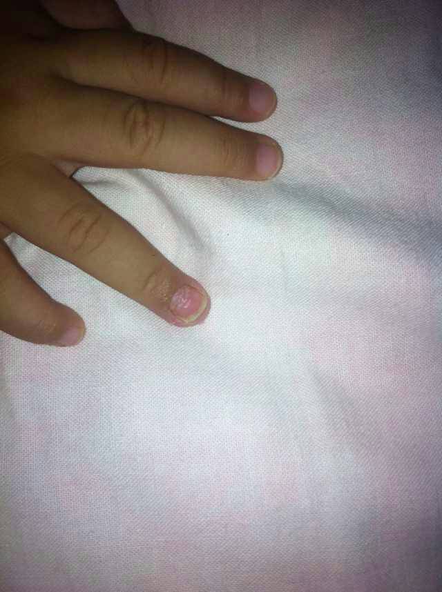 宝宝一岁两个月,前些天右手无名指手指肚开始脱皮,指甲感觉好像要脱落一样,肉跟指甲有点分离的感觉,其