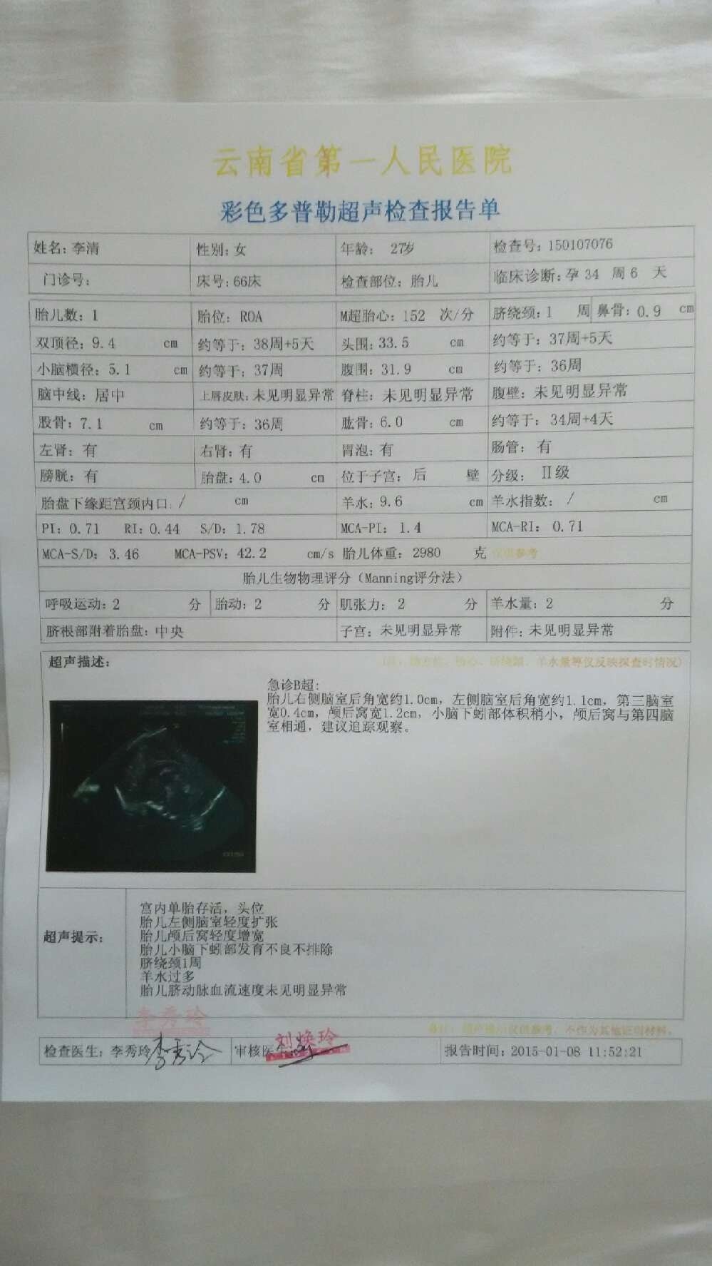 胎儿颅后脑宽1.2cm,小脑下蚓部体积稍小 点击展开 匿名用户 2015-01-11 10:59 为您推荐: 其他回答 你好,一般情况下,侧脑室数值不超过1.0CM,应该没什么问题,如果超过1cm,要防止畸形的,必要时羊水穿刺检查,排除脑积水比较好的。 2015-01-11 12:44 相关问题 今天去医院检查检查出来吓我一跳,亲们帮我看下这是什么意思,后颅窝池宽约1 2cm,小脑蚓部回声欠连 孕25周双顶径69mm头围244腹围222mm小脑横径29mm后脑窝池4mm股骨长53肱骨长48m 我家宝宝刚满月,睡觉时头很少平躺,要么左侧,要么右侧,所以后脑勺不好看,有人说平躺会影响小脑发育