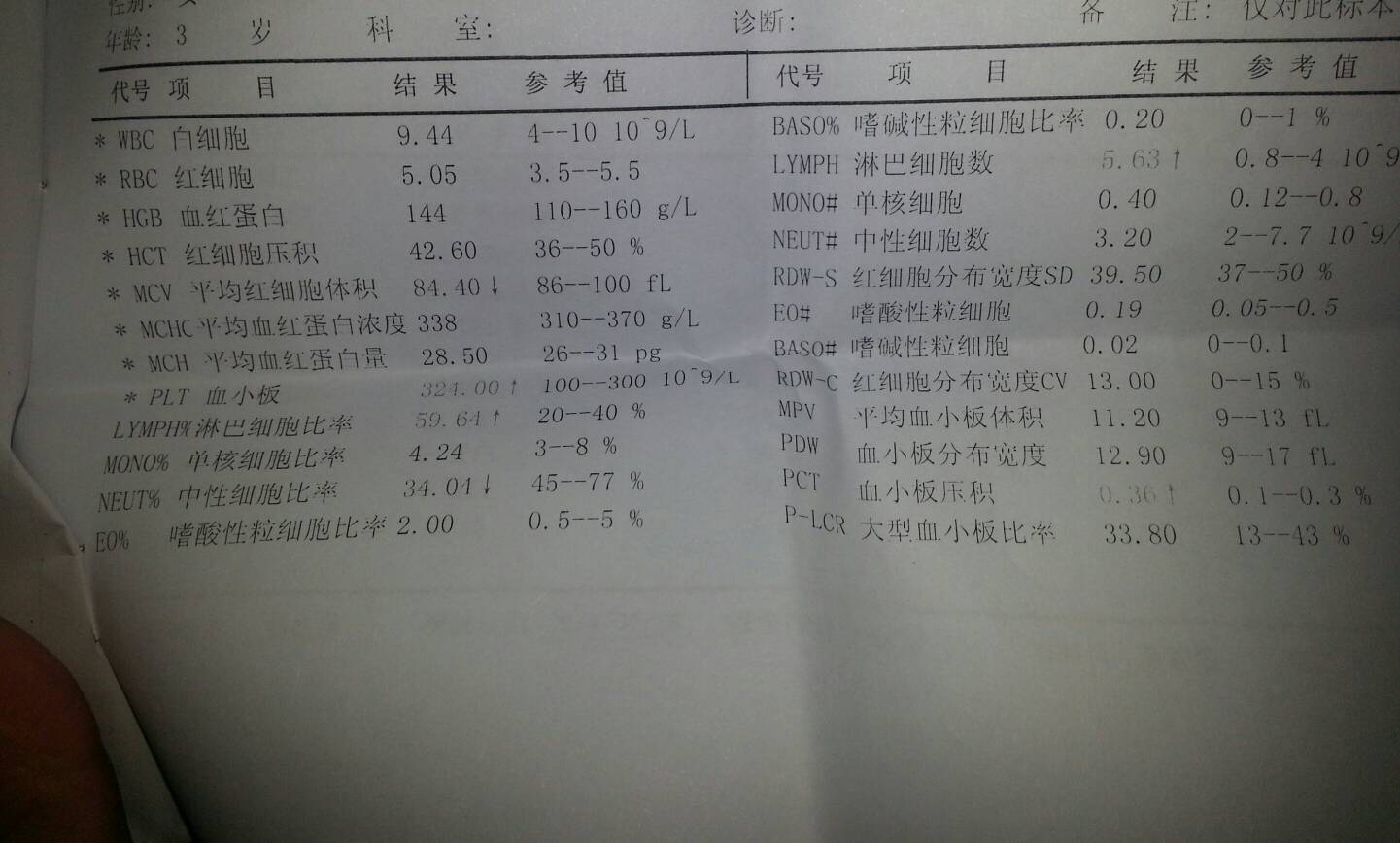 女孩三岁了 请医生给看看这张化验单有6项不合格的,没有什么症状,这是入幼儿园前体检检查,没问题吧? 点击展开 匿名用户 2014-07-31 21:47 满意回答 大致正立眨常,只是淋巴细胞比率略高一点,一般提示近期沃降有病毒感染(炼航俗如感冒等),多喝点水,慢慢就没事了,不用担心,检查结果挺好的。 匿名用户 2014-07-31 22:11 宝宝知道提示您:回答为网友贡献,仅供参考。 相关问题 女儿三岁多了,在幼儿园午睡总是尿床,几乎每天都尿裤子,去医院看了,抽血化验一切正常,还被医生说一顿 我宝宝(女孩子)今年刚刚7个月,昨天去体检说我宝宝营养不合格,现在是65CM,15斤重,请专家们帮忙告知! 我家宝宝今天去体检,医生说身高体重都不合格!我该怎么办?