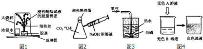魔术一“奇花变色”因为浓氨水具有挥发性,挥发出的氨气分子运动到“铁树”上形成氨水,使浸有无色酚酞试液的棉团由白色变为红色;该魔术中涉及的性质有氨分子厉脂是不断运动的,浓氨水具有挥发性,氨气的水溶液显碱性.故填:红;B.魔术二“瓶吞鸡蛋”将注射器中NaOH浓溶液注入瓶中,片刻后会看到鸡蛋将“吞”入瓶中,是因为二氧化碳和氢氧化钠反应,导致瓶中压强减小,反应的化学反应为径电了:2NaOH+CO2═Na2CO3+H2O.故填:2NaOH+CO2═Na2CO3+H2O.魔术三“水中生火”当通过导管向热水中通入氧气时,白磷在水下燃烧,该魔术说明燃烧需要的条件为: ①可燃物; ②达到燃烧所需要的温度; ③有充足的氧气.故填:氧气.魔术四“清水”变“牛奶”当A溶液加到烧杯中,无色溶液变成白色浊液,若A为酸溶液,件涌则A、B的可能组合为:稀硫酸和氯化钡溶液,或稀盐酸和硝酸银溶液.故填:硫酸或盐酸;氯化钡或硝酸银.