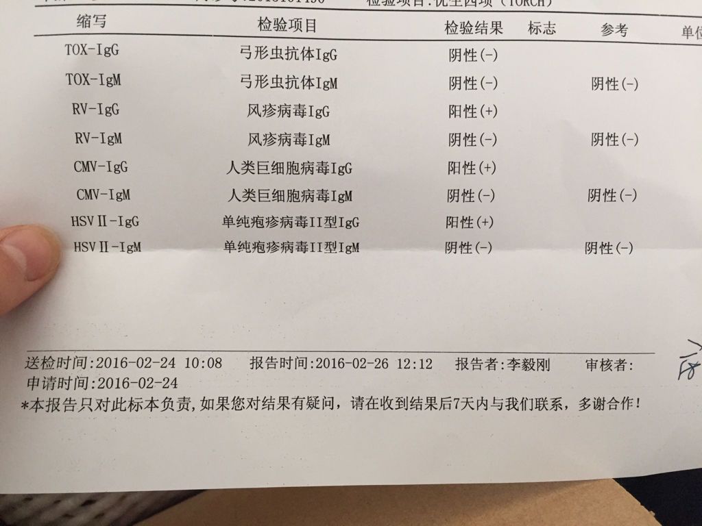 亲们 帮我看看我做的优生四项 孕8周做的 看不懂啊 今天那个医生不上班 得明天给她看 有知道的亲们 亲们 帮我看看我做的优生四项 孕8周做的 看不懂啊 今天那个医生不上班 得明天给她看 有知道的亲们先告诉我 谢谢啦 点击展开 哼哈1799 2016-03-01 11:08 满意回答 意思是说都没事,而且还有抗体,说明不会有胎儿畸形发生。 植向秋_nXYc 2016-03-01 16:56 宝宝知道提示您:回答为网友贡献,仅供参考。 为您推荐: 其他回答 近期有病毒感染! 匿名用户 2016-03-01 15:01 相关问题 急急急…请医生帮我看看,因为家里养有狗、29周今天去医院做优生10项,有四项为阳性这是什么意思呢? 孕37周了,这是今天做b超的单子,麻烦帮我看看宝宝怎么样了?近一个月我体重都没长,医生说宝宝很小 今天去孕检了,都是正常的,医生说明天早上在去验血,请问下那个血不验可不可以呢?