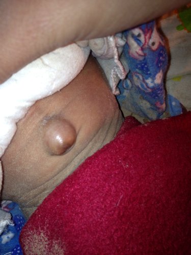 这是脐疝,有的会自己好,如果不管也有一部份要将来做个小手术,孩子一哭突出的更明显。方法:取一枚1元硬币用水煮开消毒,再取消毒后的纱布将硬币包裹起来,用宽5公分的松紧带把包好的硬币的一面贴在上面缝上,根据宝宝肚围的大小来决定松紧带的周长,不能太紧也不能太松,给宝宝带上时要注意让硬币的一面正对宝宝的肚脐...