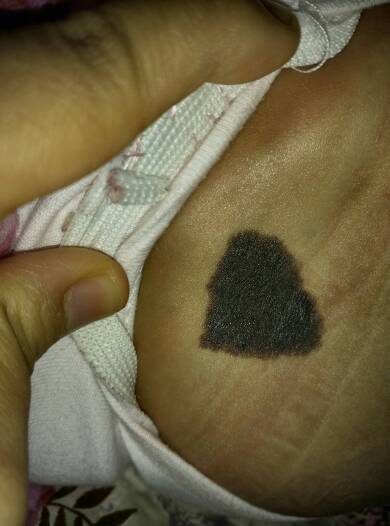 女宝宝四个半月出生就有摸上去跟肉一样的没有突出的 颜色大小到现在都没有变化 帮忙看看是胎记还是什么
