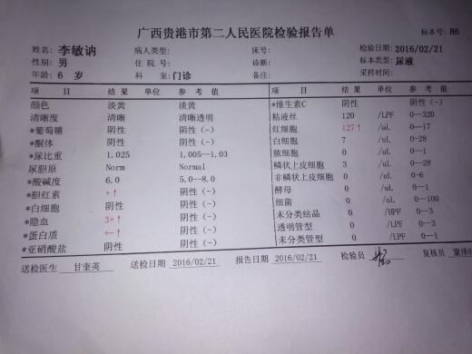 6岁小孩尿多,b超查了没问题,验尿有隐血3十,红细胞127,尿液有点黄如图严重吗 点击展开 匿名用户 2016-03-03 14:40 满意回答 你好,正常情况下耻葛尿中没有血,出悟件现的话多考虑泌尿系瓣梅瓦统疾病,建议先判断红细胞来源。 羽化翩跹lc 2016-03-03 17:50 宝宝知道提示您:回答为网友贡献,仅供参考。 相关问题 女孩,3岁,尿液检查隐血+-,镜检红细胞 尿液中有隐血,红细胞白细胞含量高,还有维生素C 产后哺乳期尿蛋白+2,隐血+3,红细胞123 好像是肾有问题,应该注意什么?可以补蛋白质粉吗?