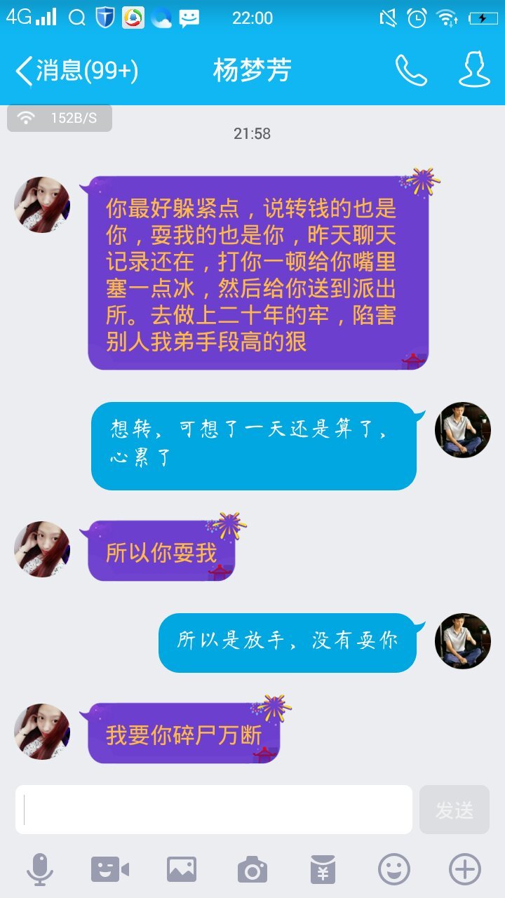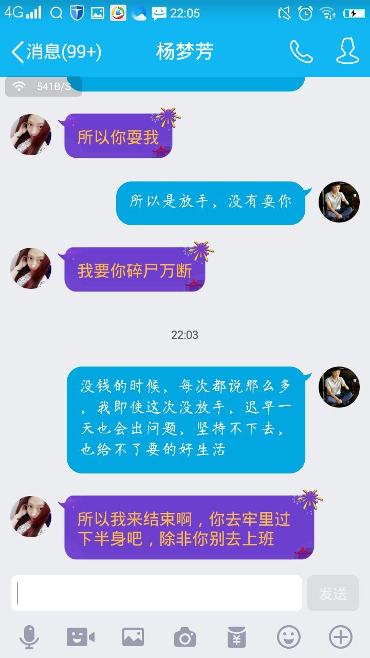 我交往的一女孩,交往了半年多,因为生日问我要钱,没钱给她,昨天闹分手,结果说这恐吓话,我到底该怎么