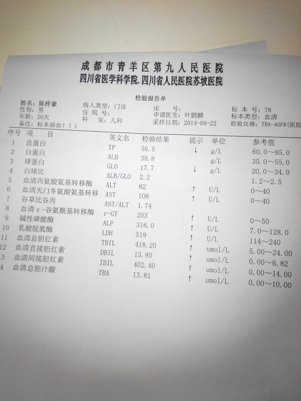 求哪位医生帮忙解答哈,这是什么性黄疸呢,孩子都二十天了,血清总胆红素418.20,血清间接胆红素4 求哪位医生帮忙解答哈,这是什么性黄疸呢,孩子都二十天了,血清总胆红素418.20,血清间接胆红素402.40我好担心哦 点击展开 158*****340 2016-03-08 17:30 为您推荐: 其他回答 宝宝要是出生后2周黄疸未消退,多见于病理性黄疸的,目前检查胆红素看数值高明显的,需要积极住院蓝光照射,退黄治疗的。 yh918 2016-03-12 04:10 相关问题 婴儿40天有黄疸检查化验血总胆红素,直接胆红素和间接胆红素都偏高于正常值范围 偏高主要是什么原因? 求哪位医生帮忙解答哈,这是什么性黄疸呢,孩子都二十天了,血清总胆红素418 20,血清间接胆红素4 我家宝宝37天时,血清直接胆红素20 2,间接胆红素40,总胆红素60 2!换算成黄疸值是多少?偏