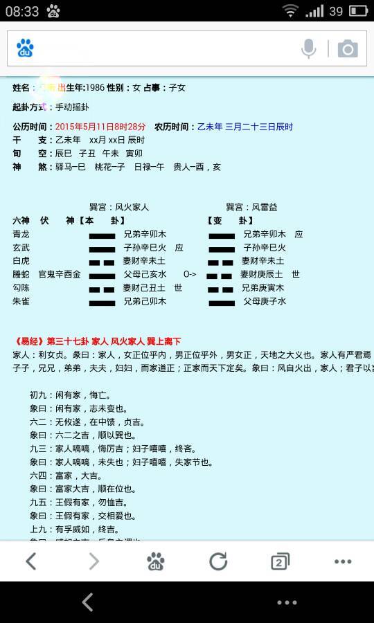 六爻求子,第三十七卦求解,何时能孕,谢谢 点击展开 匿名用户 2015-05-11 09:33 为您推荐: 其他回答 月日都没有,这种我是断不出来。 匿名用户 2015-05-19 21:08 13年应该有流产过。目前应该有孩子了可以去检查下 匿名用户 2015-05-17 01:15 刚入秋的时候希望大,是个男孩。 泥谷槐_UMTq 2015-05-11 12:51 应该是秋天怀孕,大概在阳历的9月份。 匿名用户 2015-05-11 10:14 相关问题 六爻 求子 乾为天卦 求解卦 什么时候有希望怀孕 六爻卦,求解!本周期有希望吗?何时能好孕? 六爻解卦,问本月时候有孕