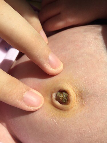 宝宝出生十二天脐带掉了,但是肚子上的皮肤把肚脐眼盖住了一半,脐窝有一半干了,被盖住的一半还是湿的