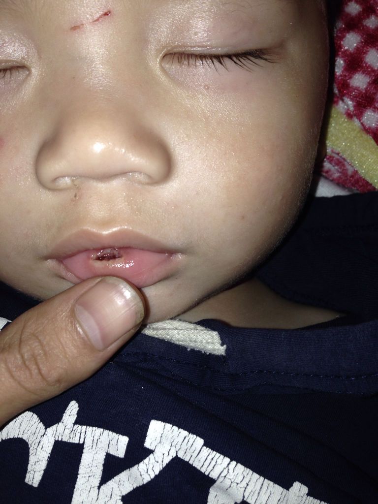 今早8点,宝宝从床上摔下碰到个凳子,咬破下嘴唇内,伤口有一厘米左右,我就顺便带宝宝到保健院体检,问