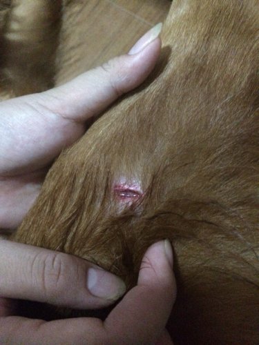 急!八个月金毛后腿不知被什么划伤!今晚带她出去玩了很久,回来后也没异常,我都是睡觉前摸摸她才发现了