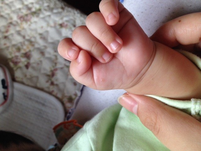 大夫和大家看一下宝宝(三个月)手上起了两个类似水痘的疱状物,这是什么,应该怎么办?