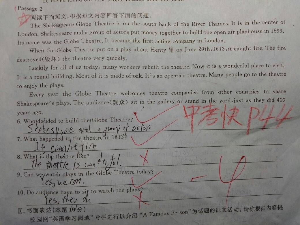 初一英语快递p44,孩子的练习题,阅读回答问题,8,10,做错了,请学霸帮忙指点一下,谢谢大家 初一英语快递p44,孩子的练习题,阅读回答问题,8 ,10 ,做错了,请学霸帮忙指点一下,谢谢大家。 点击展开 匿名用户 2015-05-23 20:53 满意回答 8.It's a round buildind. 10.No, they don't. 匿名用户 2015-05-23 20:59 宝宝知道提示您:回答为网友贡献,仅供参考。 为您推荐: 其他回答 8、用第三段第二行那个回答! 匿名用户 2015-05-23 20:56 相关问题 初一英语,快递,孩子的练习题,5,6,做错了,请教一下,孩子为什么会错?他欠缺的方面是那里 公公婆婆霸着孩子不给我我和老公闹崩了不说话了啊 告诉宝妈们孩子要是起湿疹了,用肤霸药膏,可好用了