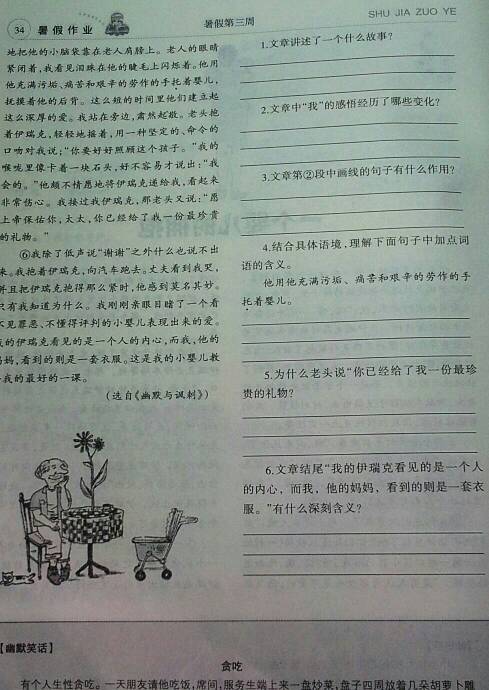 1.一个婴儿用他纯真无邪的拥抱温暖了一个流浪汉,感染和教育了他的母亲。(3分,意思对即可) 2.困窘——厌恶——肃然起敬(3分) 3.侧面烘托(1分),体现了餐馆里人的惊讶和不解以及我和丈夫的尴尬。(2分,共3分,意思对即可) 4.动作描写(1分),生动形象地表现了老人对婴儿的珍视、小心翼翼和感激。...