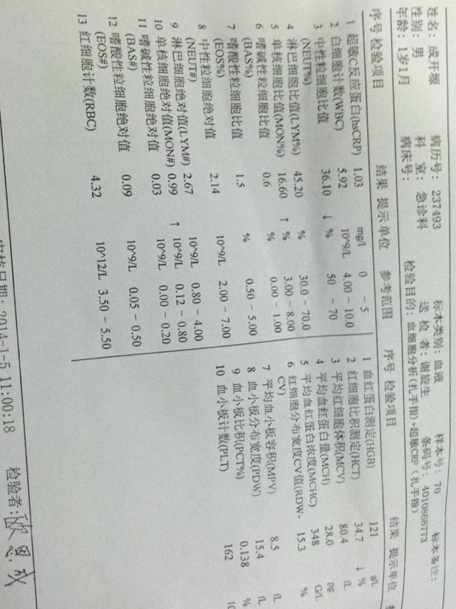 1岁1个月幼儿,高烧3天不退做了血细胞分析和超敏CRP,白细胞不高,喉咙有脓性疱疹,每次烧都39 度,吃了美林,头摸着不烫,但体温很高。。感觉他特别困,经常睡觉。。手脚都特别冰。。。急啊,坐等答案,请各位大侠支支招,看如何用药或如何物理降温啊 点击展开 匿名用户 2014-01-06 21:42 为您推荐: 其他回答 从血象上看,还是病毒感染的可能性比较大 匿名用户 2014-01-06 21:49 相关问题 我家宝宝八个月,昨天发烧一天,今天到医院就诊,做了血常规,白细胞正常,淋巴细胞高,儿科大夫检查后说疱疹咽炎,就让服用护彤和安瑞克,可宝宝总是反复发烧,最高烧到3 宝宝四岁crp21 6 白细胞13 34中性粒细胞比率85 7 淋巴细胞比率9 6 持续高烧3 出生10天的婴儿现在重症监护室发烧38度到39 2度,血常规显示白细胞5,CRP110进重症1天出