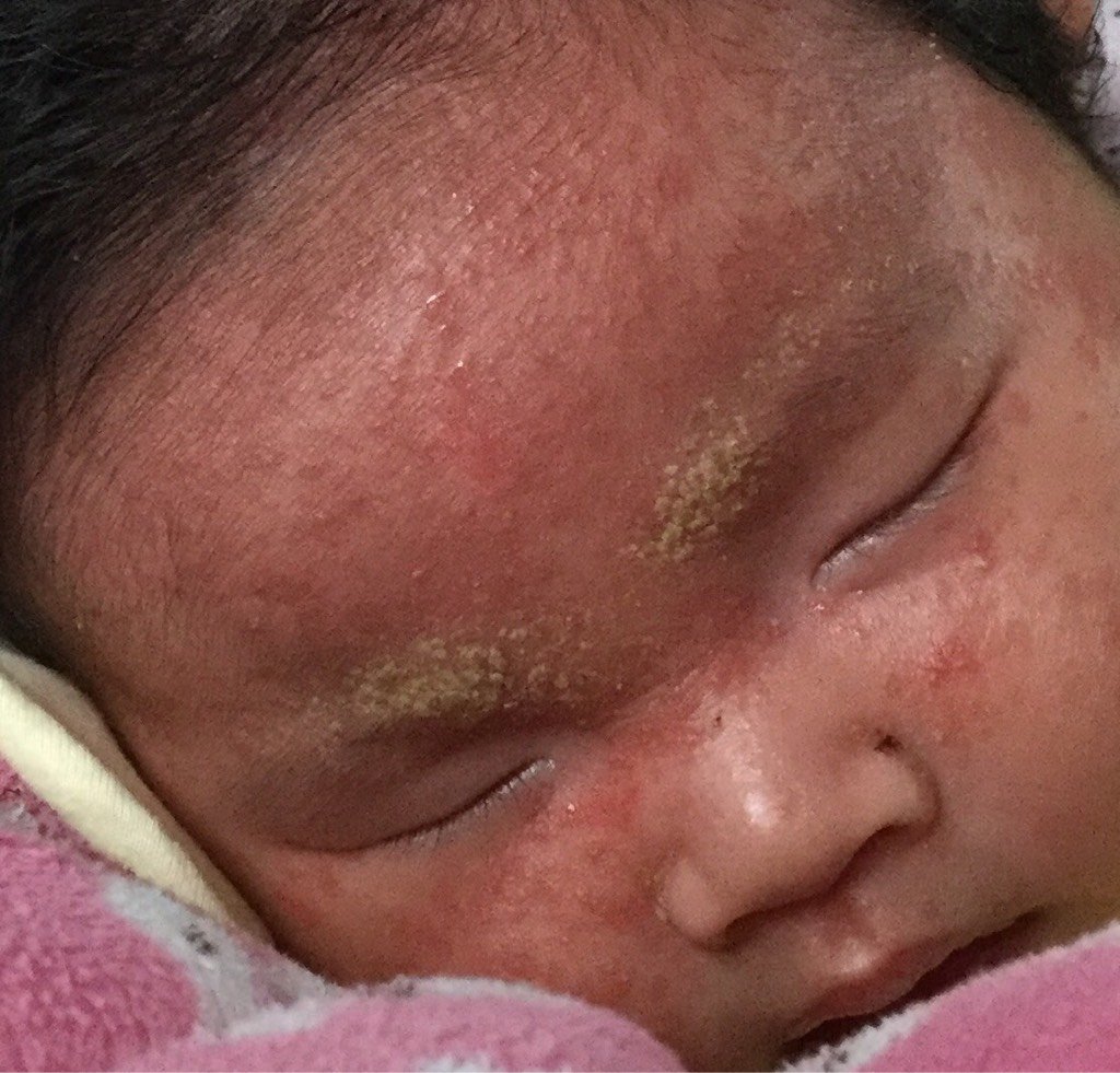 宝宝刚刚一个月,头上长了较多疹 特别眉毛处有黄色的硬荚 不知道怎么办,乡下不方便,所以问问达人和医